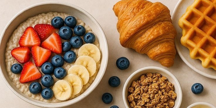 Individual plated serving of a roasted vegetable, falafel, baked beans, scrambled eggs, mushrooms, roasted tomatoes, and toast